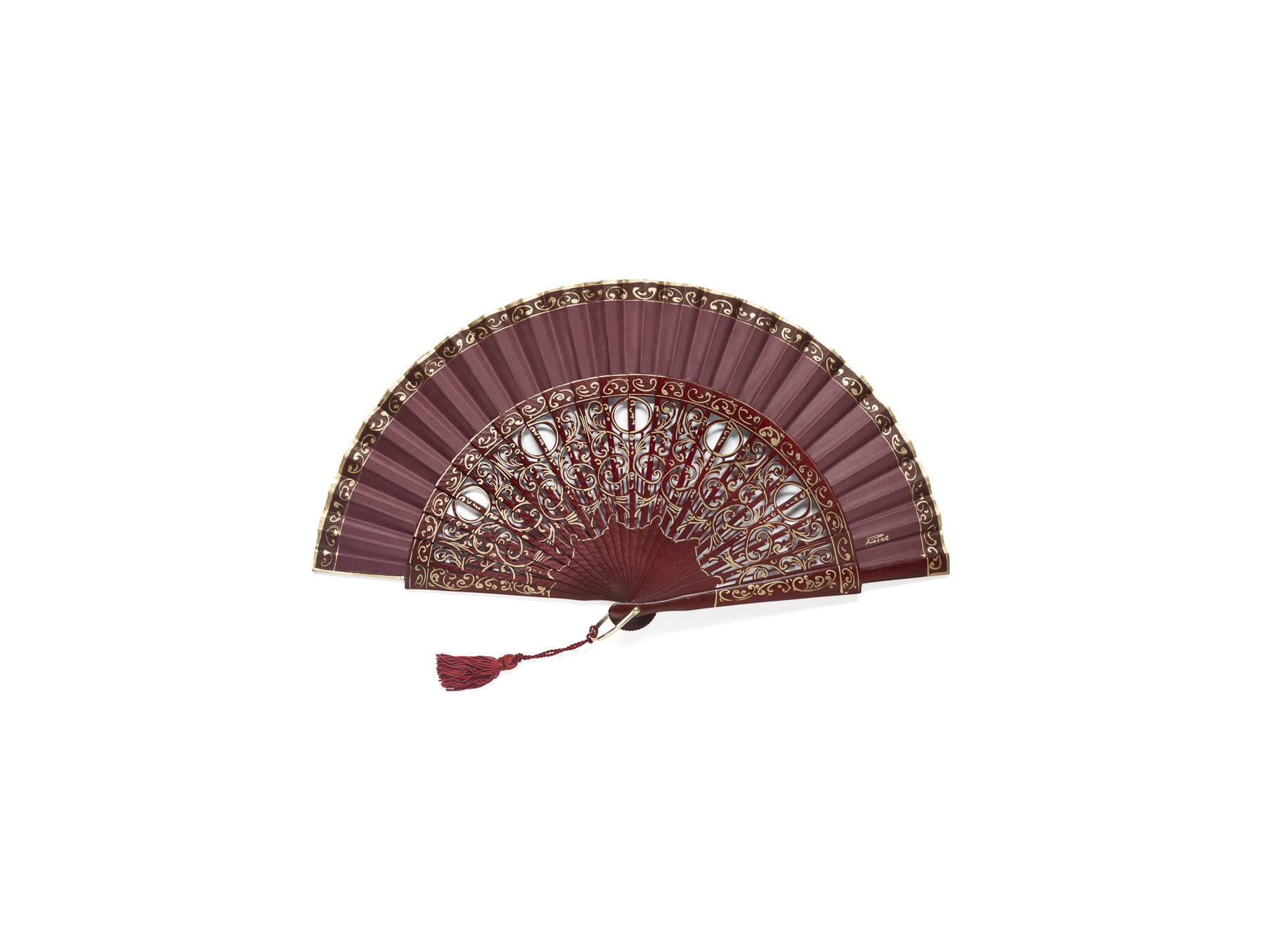 Varilla calada y país de algodón ambos en color granate pintado a mano con suaves detalles en color dorado.