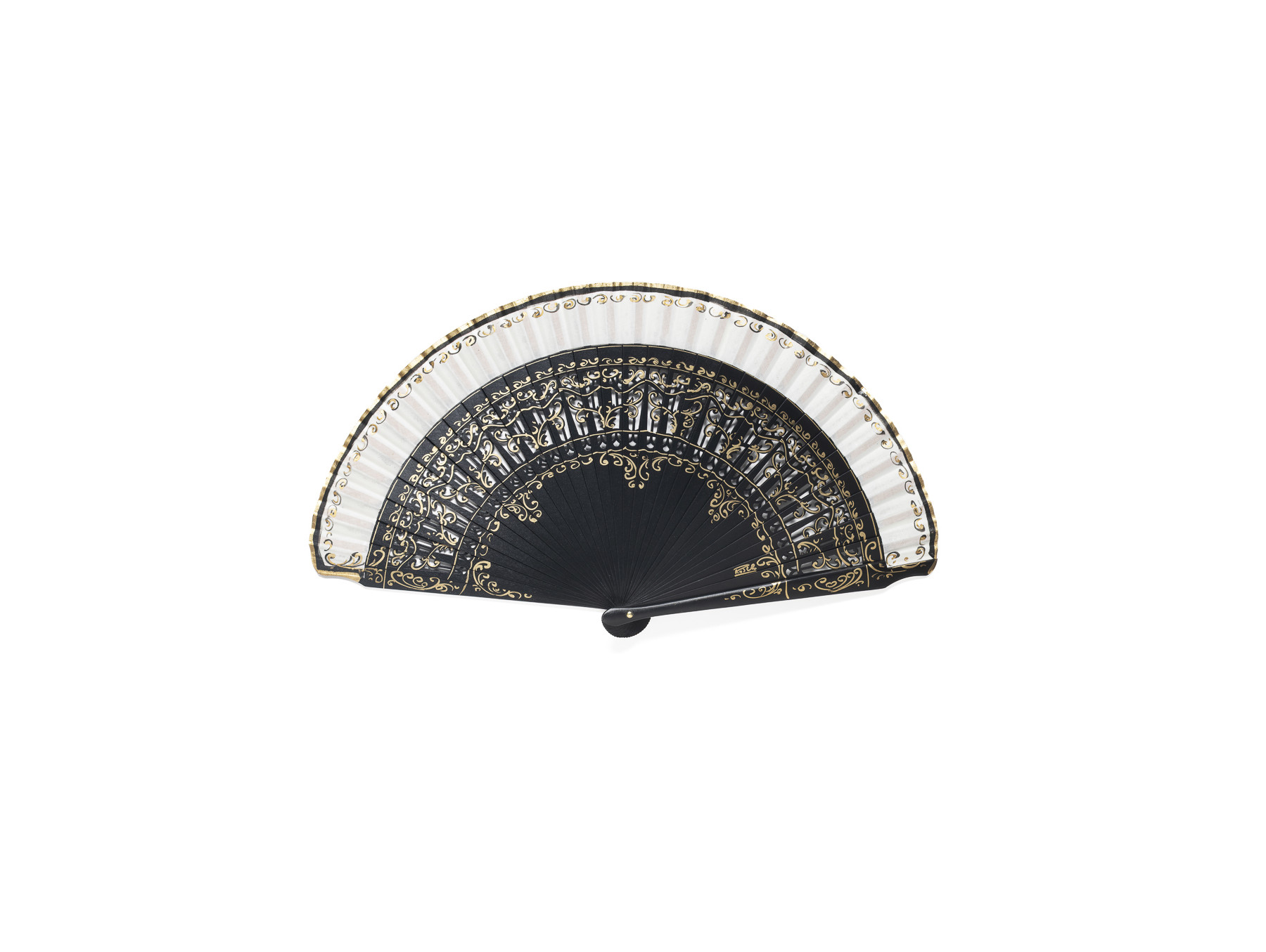 Pequeñas ondas y volutas pintadas a mano adornan tanto varillas como país de algodón, de color blanco