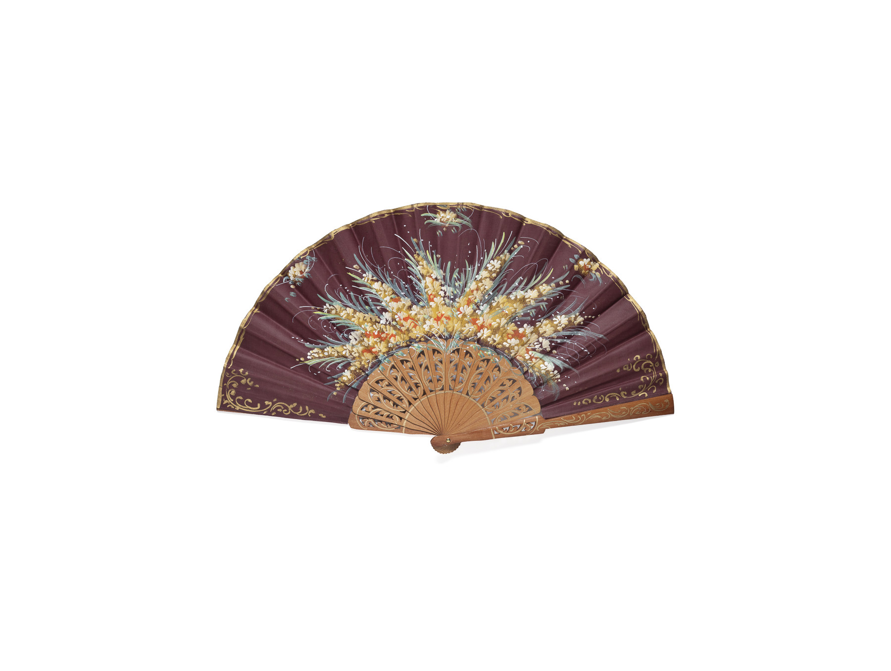 El diseño calado de su varillaje se acompaña de delicadas pinceladas doradas que se extienden por las esquinas del país del abanico