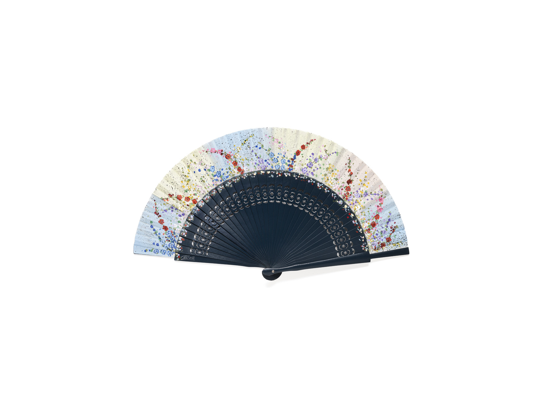 Varillaje calado en color azul petróleo, con acabado de lacado. País de algodón con degradado en suaves tonos pastel. Pintado con minúsculas flores en vivos colores, que ocupan ambas partes del abanico.
