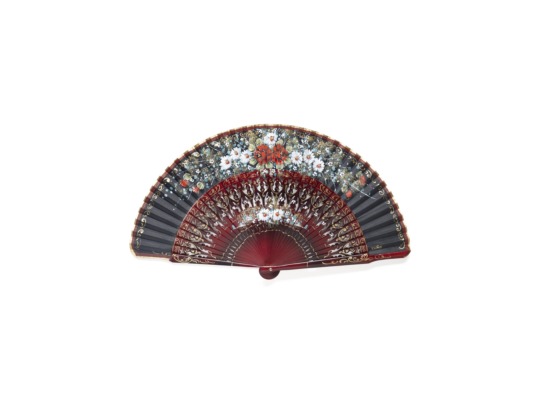 Varillaje calado de color granate, con bonitos detalles dorados que se extienden también por el país del abanico