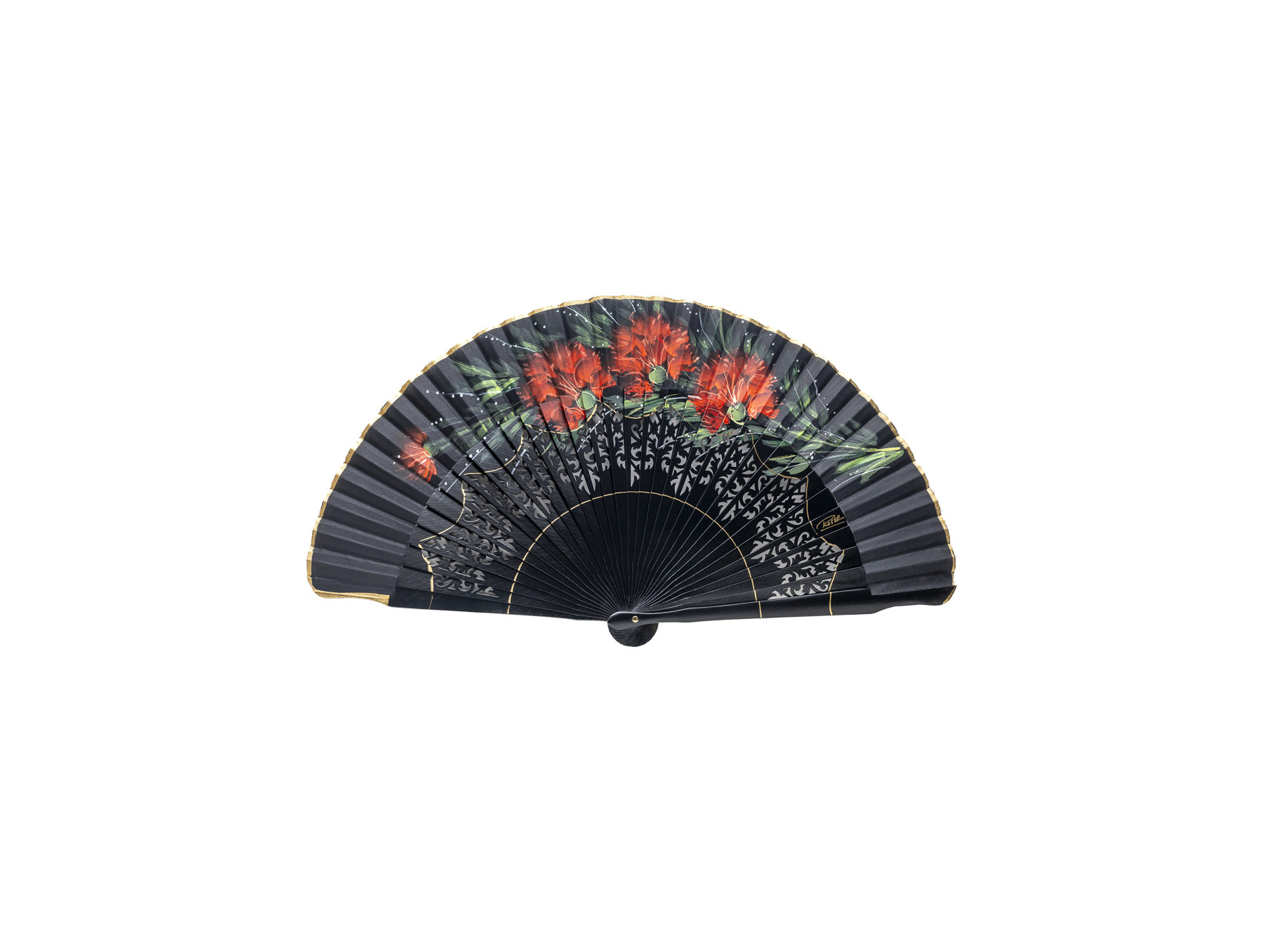 Sobre su país de algodón, también en negro, se dibujan tres grandes claveles en color rojo intenso