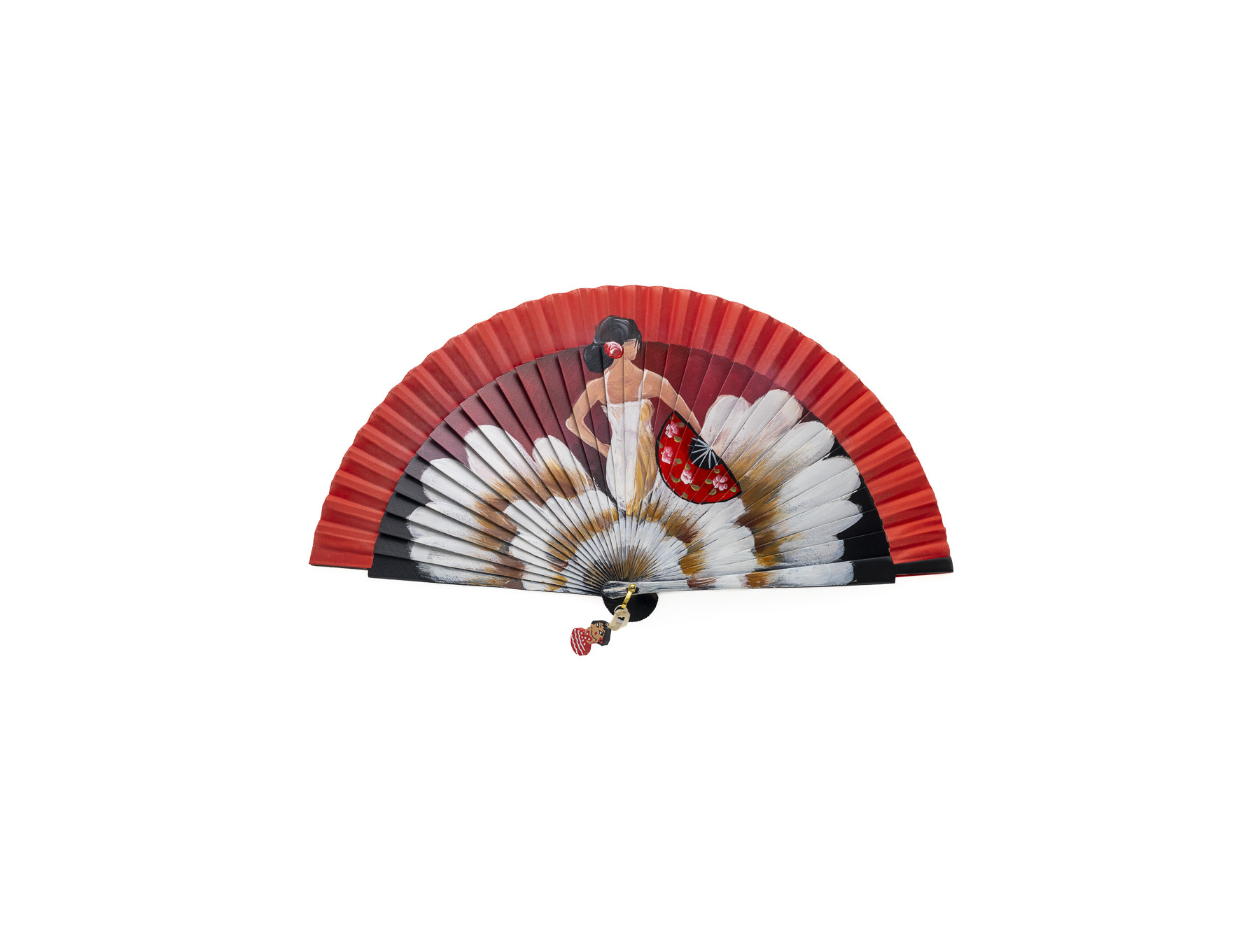 Precioso abanico en madera, pintado a mano. Lo decora la bonita figura de una mujer con un vestido que blanco sobre el que resalta un abanico en color rojo. Detalle de fondo degradado en color rojo, a juego con el país de algodón.