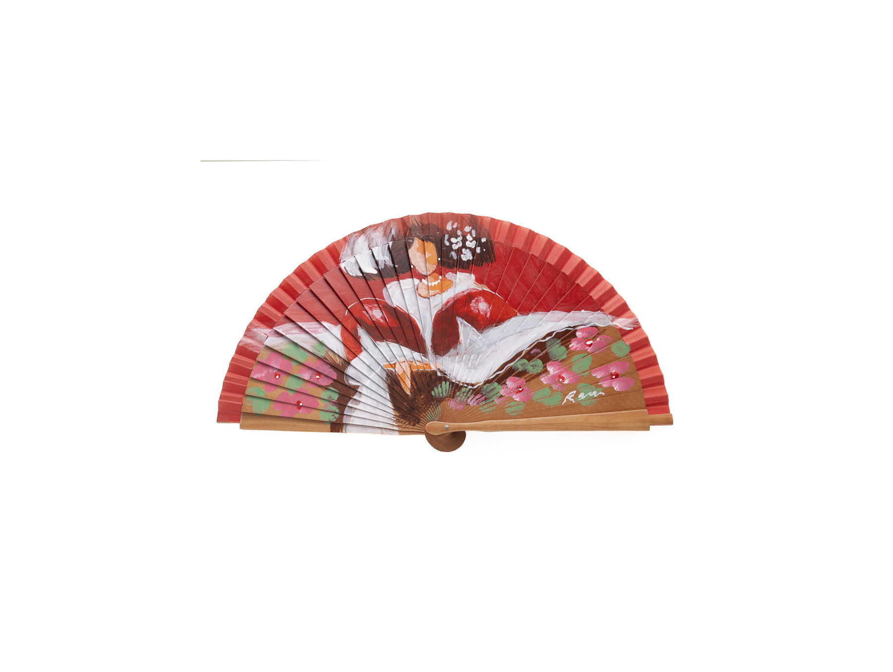 Pintado a mano con motivo cortesana; fondo en madera natural, con color rojo como fondo de la silueta de la figura, resaltada por su vestido en blanco y rojo.
