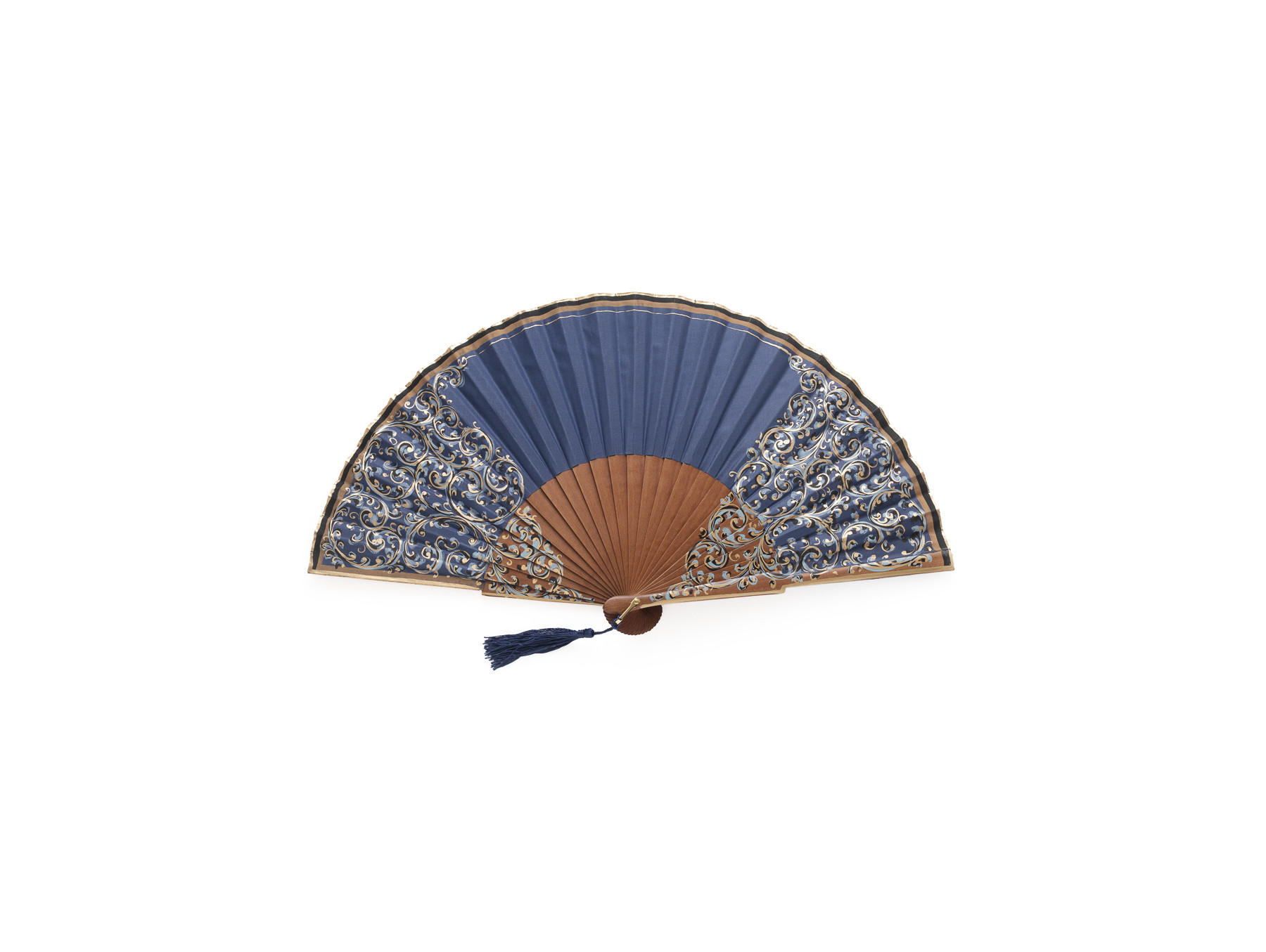 Varillaje liso pulido que mantiene su color natural con detalles de volutas en color dorado y azul bebé que se extienden hasta el país del abanico, también liso, de color azul marino