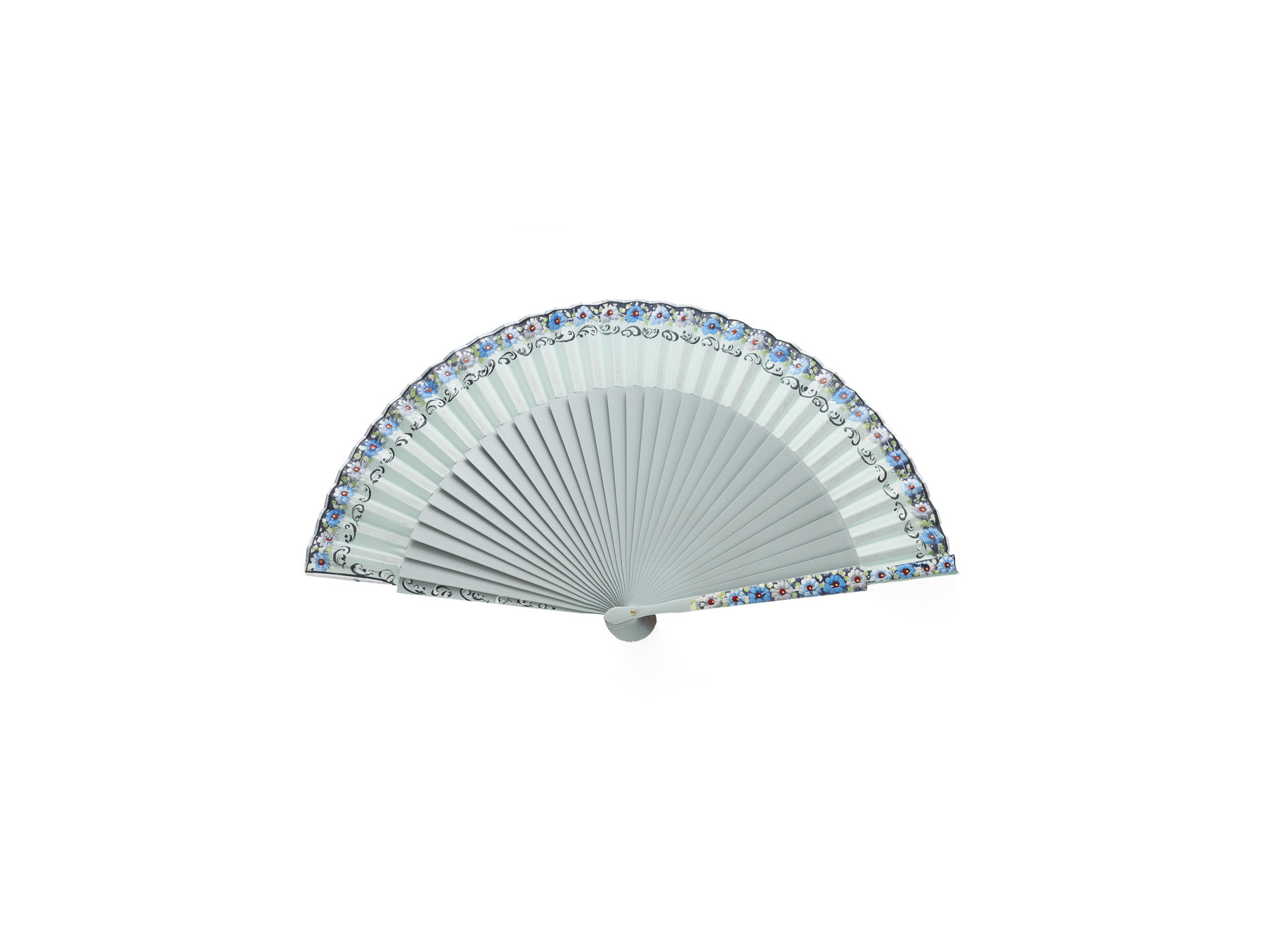 País de algodón en el mismo color con detalles florales en tonos azules que se extienden por el borde del abanico, acompañados de un filet plateado
