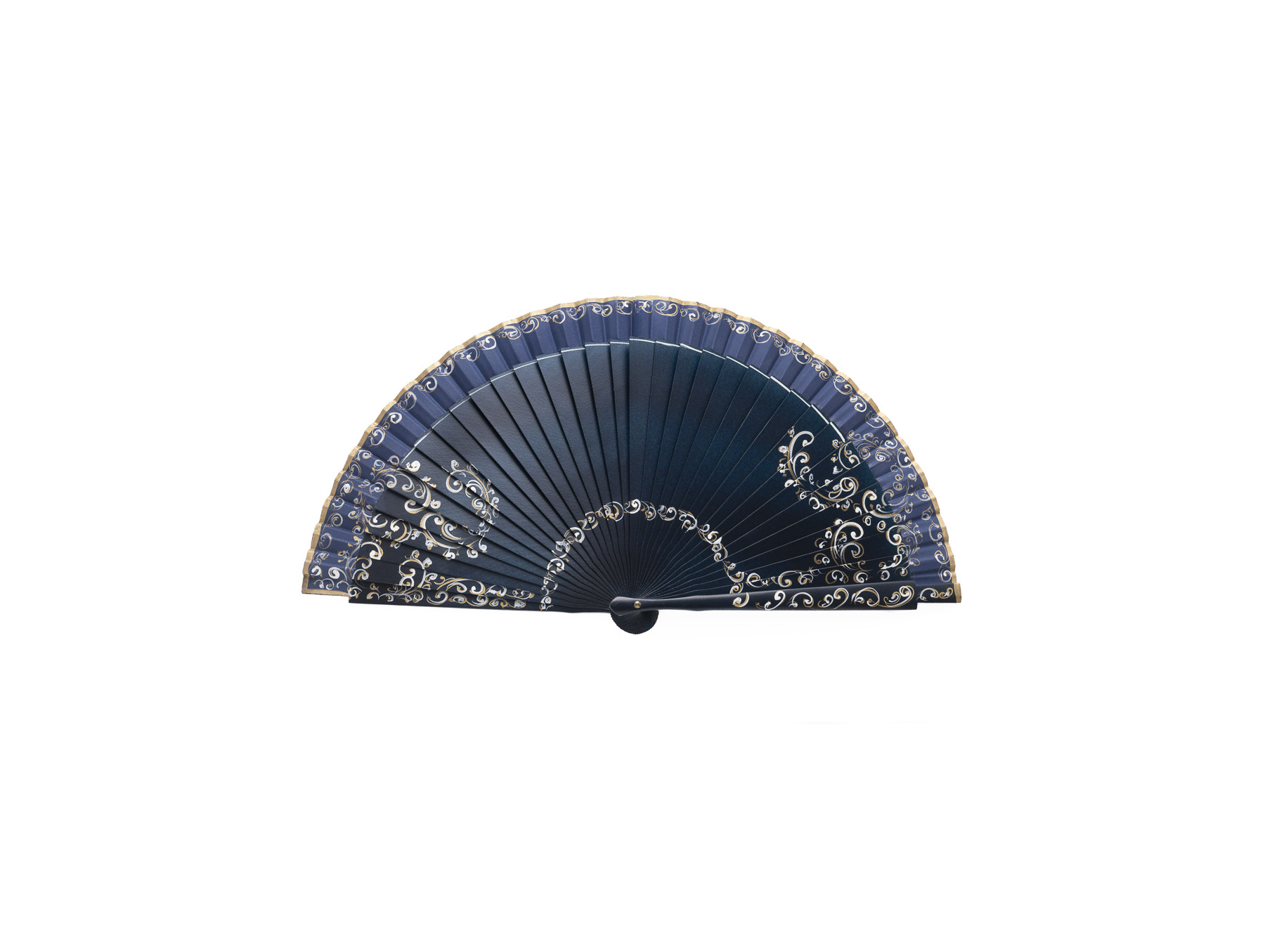 Varillaje liso satinado por ambas caras en color azul medianoche con delicados detalles de volutas en color blanco y dorado que se extienden hasta el país del abanico, también en azul y con detalle de filet en dorado